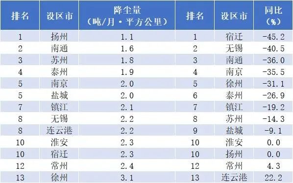 10月,13個(gè)設(shè)區(qū)市中降塵量由小到大依次排序?yàn)椋簱P(yáng)州、南通、蘇州、泰州、南京(鹽城并列)、鎮(zhèn)江、無錫(連云港并列)、淮安(宿遷并列)、常州、徐州。