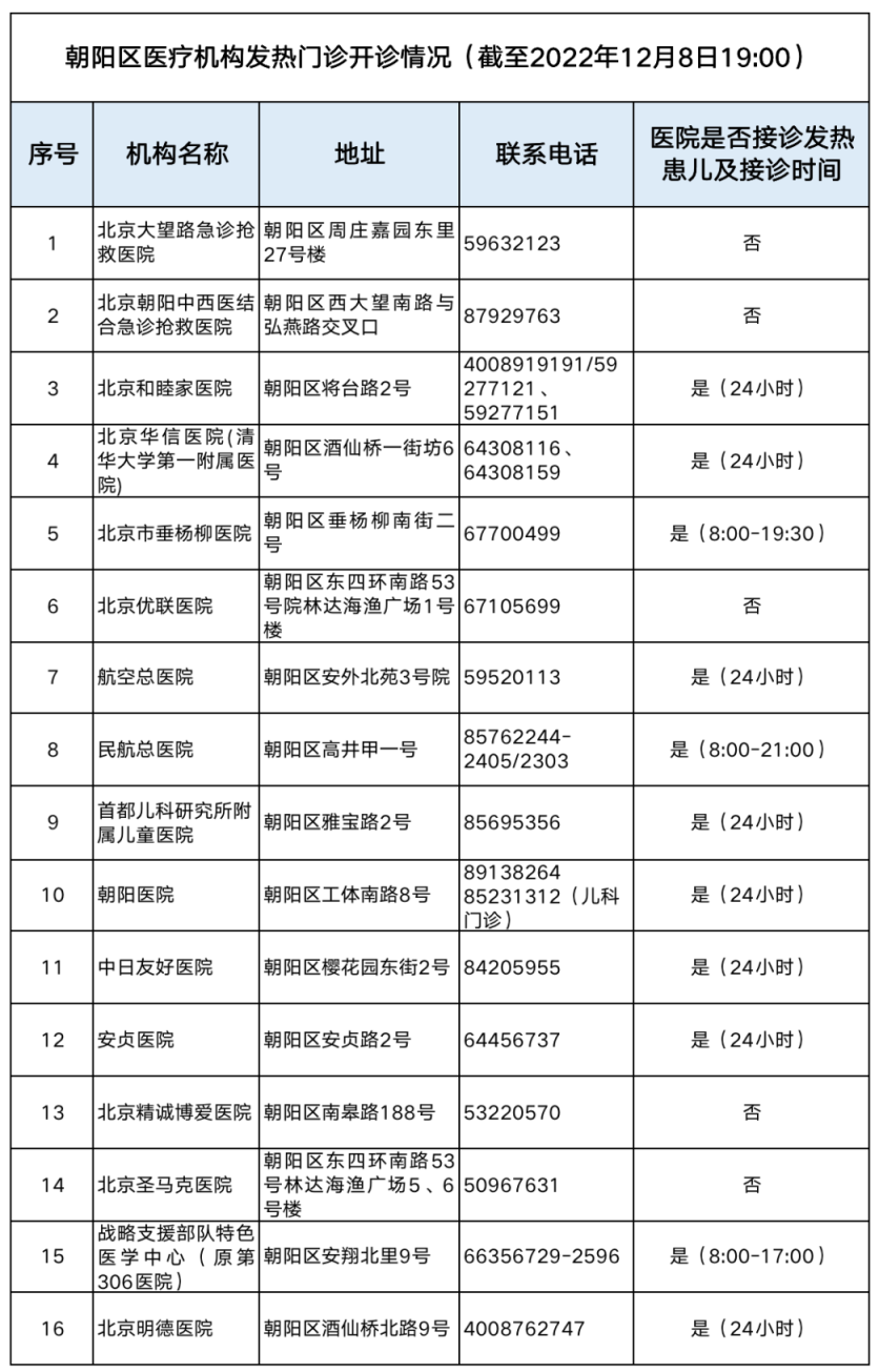 朝陽(yáng)區(qū)16家發(fā)熱門診醫(yī)療機(jī)構(gòu)信息