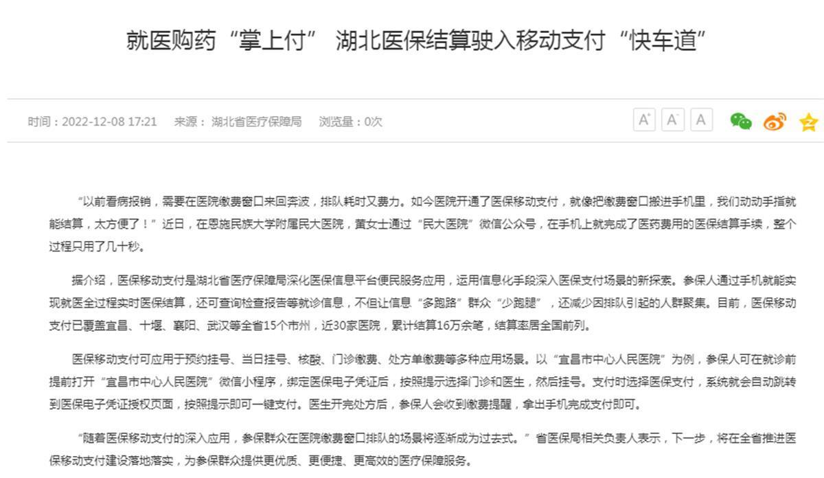據(jù)介紹,醫(yī)保移動支付是湖北省醫(yī)療保障局深化醫(yī)保信息平臺便民服務(wù)應(yīng)用,運用信息化手段深入醫(yī)保支付場景的新探索。參保人通過手機就能實現(xiàn)就醫(yī)全過程實時醫(yī)保結(jié)算,還可查詢檢查報告等就診信息,讓信息“多跑路”群眾“少跑腿”,減少因排隊引起的人群聚集。目前,醫(yī)保移動支付已覆蓋宜昌、十堰、襄陽、武漢等全省15個市州,近30家醫(yī)院,累計結(jié)算16萬余筆,結(jié)算率居全國前列。