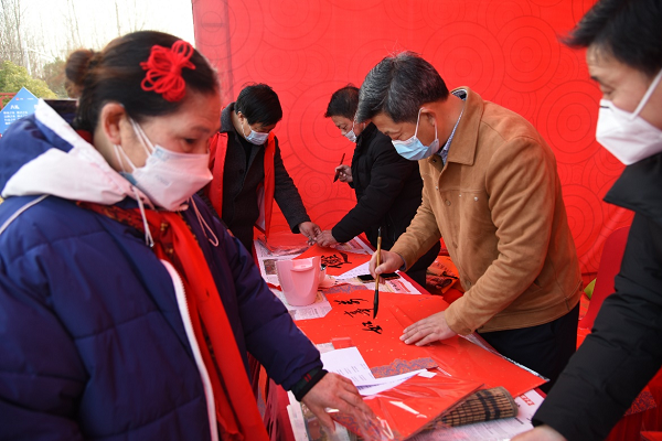 臺上歡歌載舞,臺下人頭攢動。配鑰匙、法律援助咨詢、醫(yī)生義診、眼鏡修理等服務,吸引了不少村民。書法家們現(xiàn)場書寫幾百幅福字,將新年的美好祝愿贈予村民。