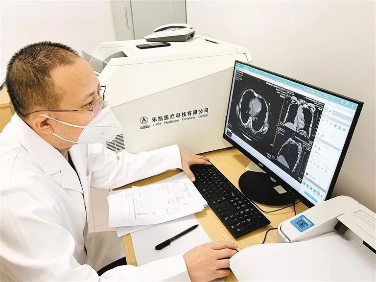 10日上午,在杜城社區(qū)衛(wèi)生服務(wù)中心診室門前,等候拍片的患者不多。在工作人員引導(dǎo)下,大家有序進(jìn)入拍攝區(qū)。診室內(nèi),陜西省康復(fù)醫(yī)院影像一科主任高雅鵬正在一個看似與普通顯示器沒什么兩樣的電腦前書寫診斷報告。“比起一般的CT靜態(tài)閱片,在這臺顯示器的幫助下,我們可以實現(xiàn)多角度、多方位、動態(tài)式閱片,讓診斷更加細(xì)致精準(zhǔn)?!?高雅鵬說,這臺CT機(jī)的配置完全可以滿足周邊居民對于肺部CT的拍片需求。