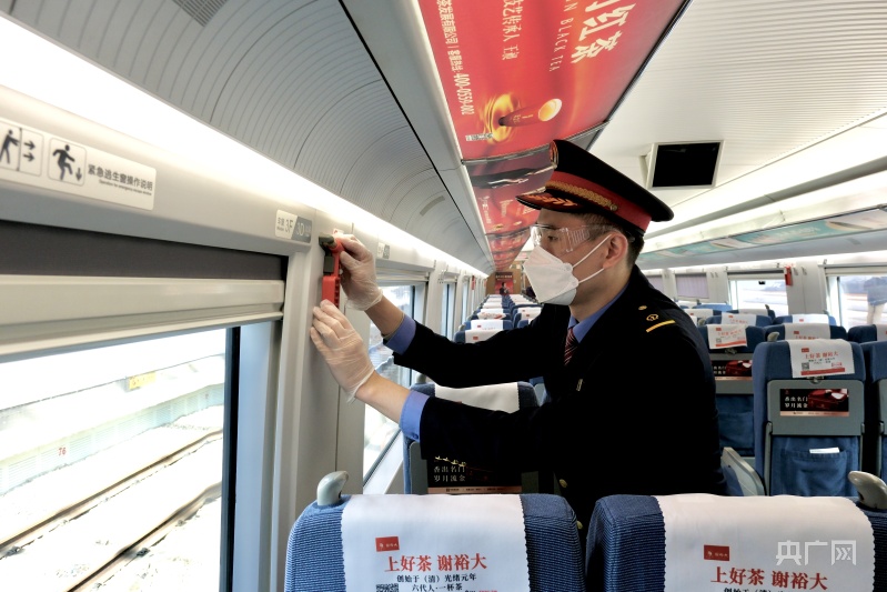 彭昊正在檢查列車內安全設備(央廣網(wǎng)發(fā) 受訪者供圖)