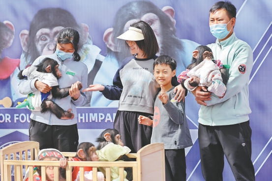 16日,北京野生動物園在萌寶幼兒園戶外展區(qū)組織“明猩見面會”活動,邀約忠實粉絲與四只小黑猩猩互動合影。本報記者 鄧偉攝