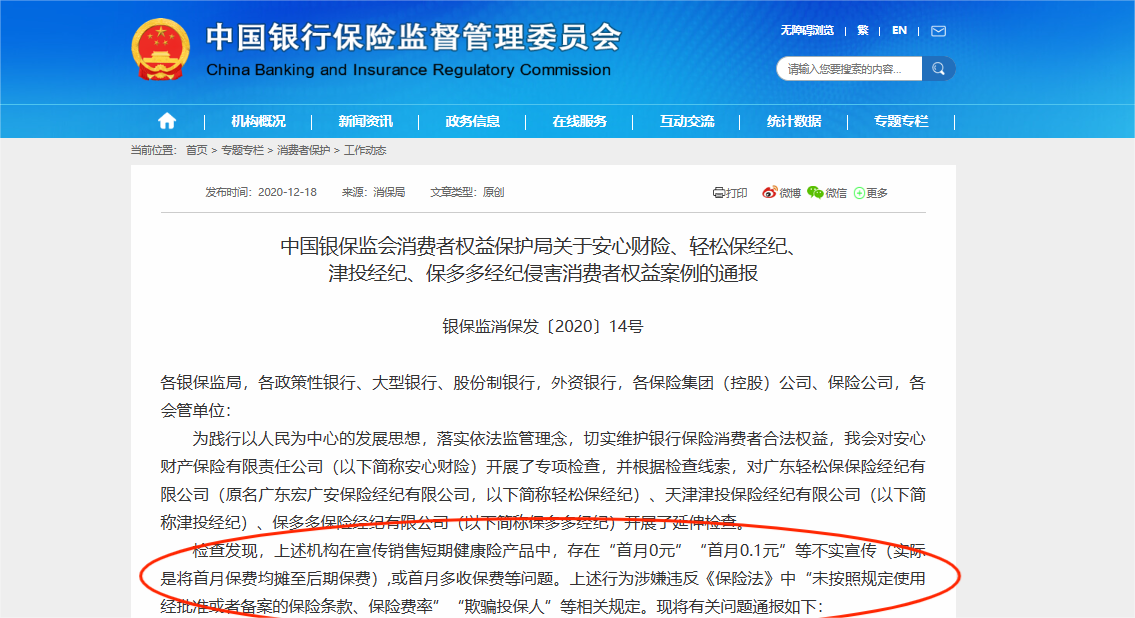 2020年,中國銀保監(jiān)會消費者權(quán)益保護(hù)局發(fā)布關(guān)于安心財險、輕松保經(jīng)紀(jì)、津投經(jīng)紀(jì)、保多多經(jīng)紀(jì)侵害消費者權(quán)益案例的通報。通報稱檢查發(fā)現(xiàn),上述機(jī)構(gòu)在宣傳銷售短期健康險產(chǎn)品中,存在“首月0元”“首月0.1元”等不實宣傳(實際是將首月保費均攤至后期保費),或首月多收保費等問題。上述行為涉嫌違反保險法中“未按照規(guī)定使用經(jīng)批準(zhǔn)或者備案的保險條款、保險費率”“欺騙投保人”等相關(guān)規(guī)定。