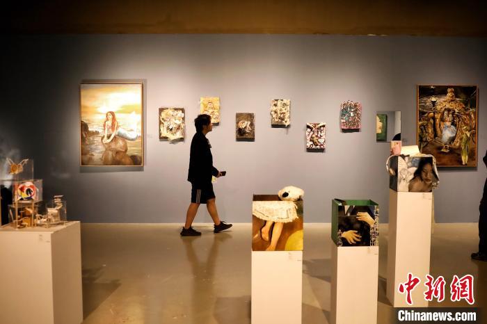 6月底,于飛在北京舉辦個人藝術展“啟程”。圖為于飛向觀眾介紹展出作品。 中新社記者 李雪峰 攝