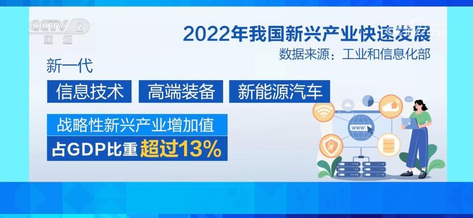 工業(yè)和信息化部部長(zhǎng)金壯龍介紹,2022年,我國新一代信息技術(shù)、高端裝備、新能源汽車等戰(zhàn)略性新興產(chǎn)業(yè)增加值占GDP比重超過13%。