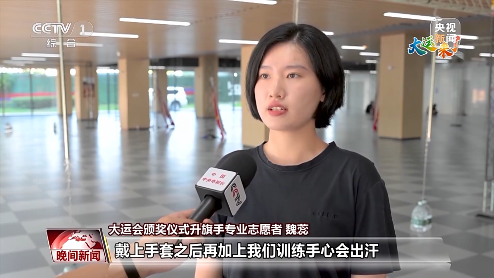 大運會頒獎儀式升旗手專業(yè)志愿者 魏蕊:我們面對的是國旗。當運動員在運動場上贏得屬于自己國家榮譽的時候,我們的工作就是幫他們詮釋好屬于他們自己的一份榮譽。