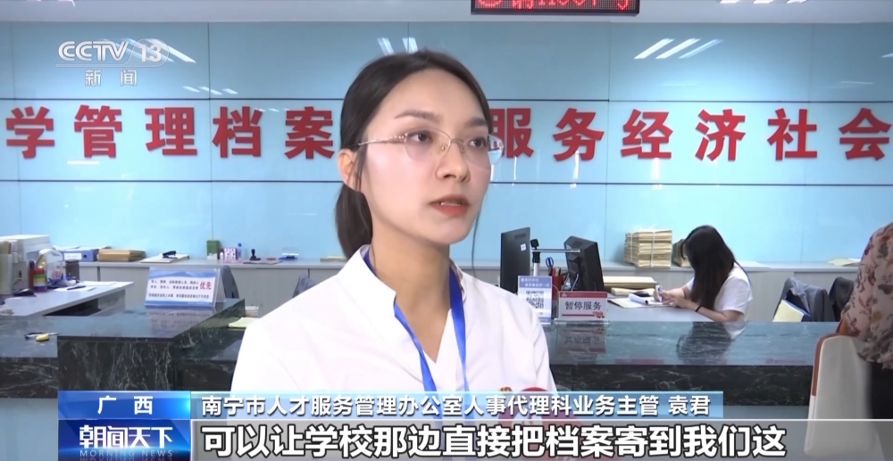 南寧市人才服務(wù)管理辦公室人事代理科業(yè)務(wù)主管 袁君:可以讓學校那邊直接把檔案寄到我們這,我們進行一個免費的托管,不需要學生本人再提供任何的工作材料到現(xiàn)場或者是在網(wǎng)上再辦理任何檔案接收手續(xù)。