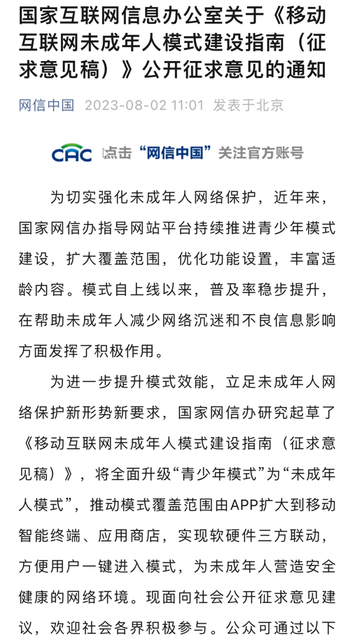 央廣網(wǎng)北京8月3日消息(總臺(tái)中國之聲記者馮爍)據(jù)中央廣播電視總臺(tái)中國之聲報(bào)道,為進(jìn)一步幫助未成年人減少網(wǎng)絡(luò)沉迷和不良信息影響,國家網(wǎng)信辦8月2日發(fā)布了關(guān)于《移動(dòng)互聯(lián)網(wǎng)未成年人模式建設(shè)指南(征求意見稿)》(以下簡稱《指南》)公開征求意見,將未成年人網(wǎng)絡(luò)保護(hù)的覆蓋范圍由App擴(kuò)大到移動(dòng)智能終端、應(yīng)用程序、分發(fā)平臺(tái),把“青少年模式”升級為“未成年人模式”。相關(guān)部門如何給未成年人網(wǎng)絡(luò)保護(hù)設(shè)置護(hù)欄?