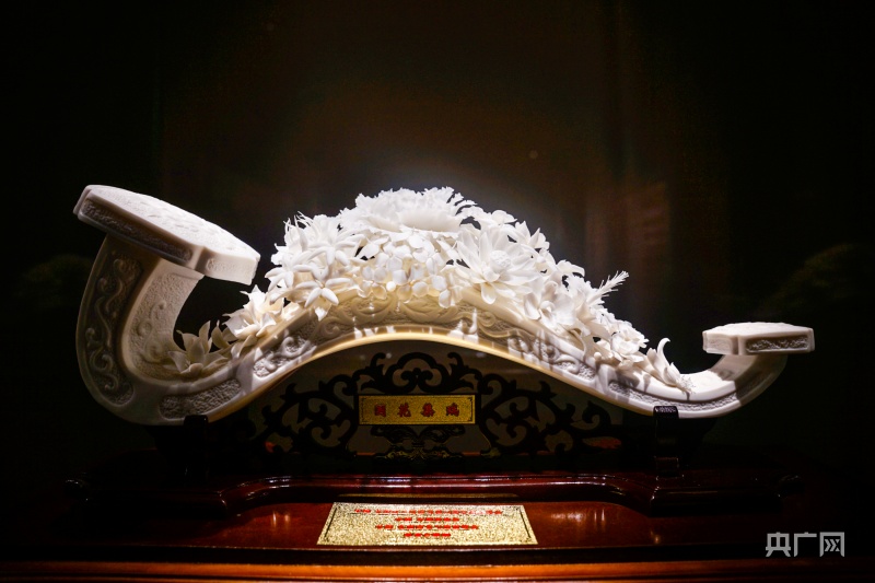 展出的德化白瓷作品《國(guó)花集瑞》(央廣網(wǎng)見習(xí)記者 李?yuàn)檴?攝)