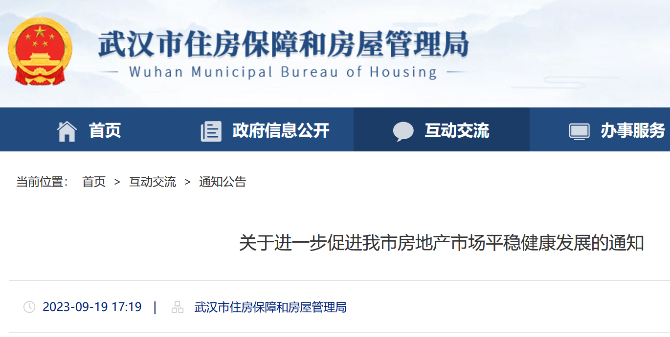央廣網(wǎng)北京9月20日消息 據(jù)武漢市住房保障和房屋管理局網(wǎng)站消息,9月19日,武漢市房管局發(fā)布《關(guān)于進(jìn)一步促進(jìn)我市房地產(chǎn)市場(chǎng)平穩(wěn)健康發(fā)展的通知》(以下簡(jiǎn)稱《通知》),《通知》顯示,自2023年9月19日起,武漢市取消二環(huán)線以內(nèi)住房限購(gòu)政策,滿足居民剛性和改善性購(gòu)房需求。