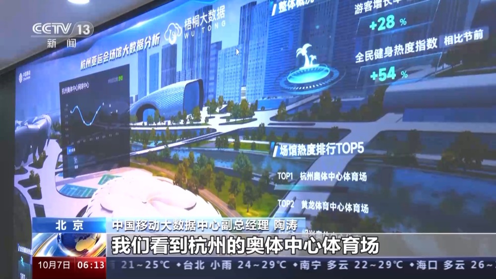 中國(guó)移動(dòng)大數(shù)據(jù)中心副總經(jīng)理 陶濤:前往亞運(yùn)會(huì)主要舉辦城市的游客的數(shù)量相比節(jié)前一周日均增幅超過(guò)28%,主要是來(lái)自長(zhǎng)三角地區(qū)以及津京冀等地區(qū)。根據(jù)我們對(duì)于線上訂票以及搜索這些數(shù)據(jù)的分析,我們看到杭州的奧體中心體育場(chǎng)、黃龍?bào)w育中心體育場(chǎng)以及紹興奧體中心體育館這三個(gè)場(chǎng)館是最熱的體育場(chǎng)館。