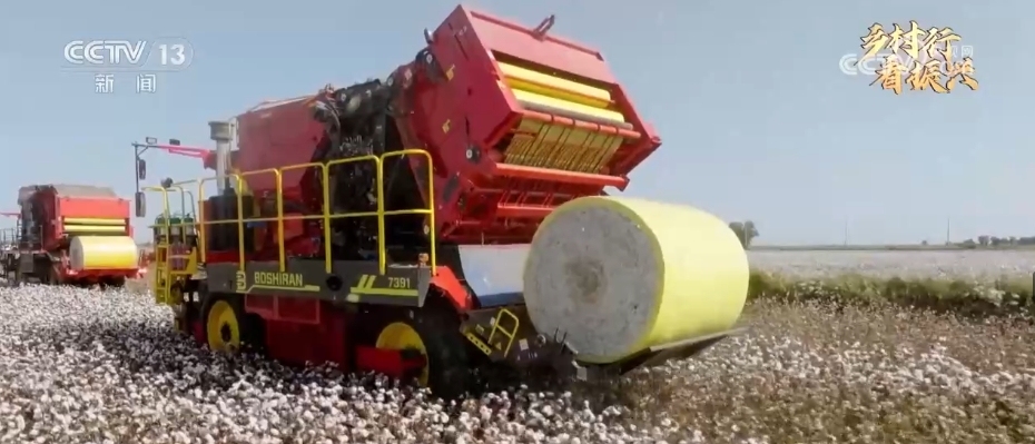 這幾年,新疆絕大部分地區(qū)都已經(jīng)實(shí)現(xiàn)了機(jī)械化采棉。棉花采收打包一體機(jī),除了自動(dòng)采棉之外,還有打包的功能,當(dāng)?shù)厝私o它取了個(gè)特別形象的名字叫“下蛋機(jī)”。當(dāng)裝棉花的車廂裝滿后,它的尾部會(huì)自動(dòng)吐出一個(gè)大棉包,這個(gè)棉包用金黃色包裝膜包裹著,從空中俯瞰像是一枚巨大的“金蛋”,既干凈又方便后續(xù)運(yùn)輸。這些“下蛋機(jī)”是這兩年最新上市的我國自主研發(fā)、自主生產(chǎn)的機(jī)器。
