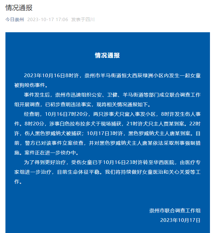 剛剛,“今日崇州”微信公號發(fā)布通報:16日8時20分,涉事白色拉布拉多犬于現場捕獲,21時許犬只主人賈某到案。22時許,傷人黑色羅威納犬被捕獲;10月17日3時許,黑色羅威納犬主人唐某到案。目前,警方已對該事件立案偵查,并對黑色羅威納犬主人唐某依法采取刑事強制措施。案件正在進一步偵辦中。