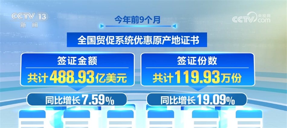 數(shù)據(jù)顯示,今年前9個(gè)月,全國(guó)貿(mào)促系統(tǒng)累計(jì)簽發(fā)原產(chǎn)地證書、ATA單證冊(cè)、商事證明書等各類證書455.06萬份,較上年同比增長(zhǎng)13.39%。