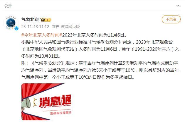 中新網(wǎng)11月13日電 據(jù)北京市氣象局官方微博13日消息,2023年北京入冬時間為11月6日。根據(jù)中華人民共和國氣象行業(yè)標準《氣候季節(jié)劃分》判定,2023年北京觀象臺(北京地區(qū)氣象觀測代表站)入冬時間為11月6日,常年(1991-2020年平均)入冬時間為10月31日。