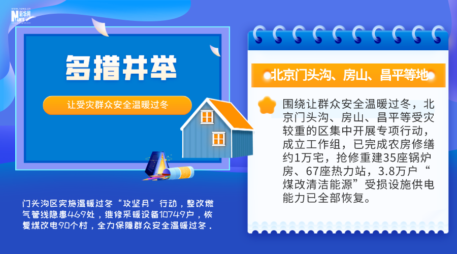 圍繞讓群眾安全溫暖過(guò)冬,北京門頭溝、房山、昌平等受災(zāi)較重的區(qū)集中開(kāi)展專項(xiàng)行動(dòng),成立工作組,已完成農(nóng)房修繕約1萬(wàn)宅,搶修重建35座鍋爐房、67座熱力站,3.8萬(wàn)戶“煤改清潔能源”受損設(shè)施供電能力已全部恢復(fù)。
