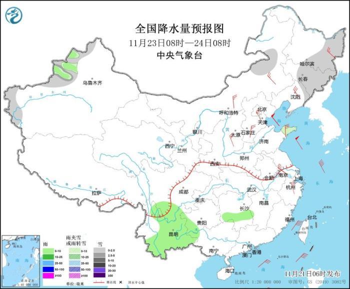 11月23日08時(shí)至24日08時(shí),新疆西部、內(nèi)蒙古東部、東北地區(qū)中東部、山東半島等地部分地區(qū)有小雪或雨夾雪,局地有中雪。湖南南部、四川南部、云南大部等地部分地區(qū)有小雨。內(nèi)蒙古中東部、東北地區(qū)大部、華北大部、山東半島、江南東部等地部分地區(qū)有4~6級(jí)風(fēng)(見圖8)。