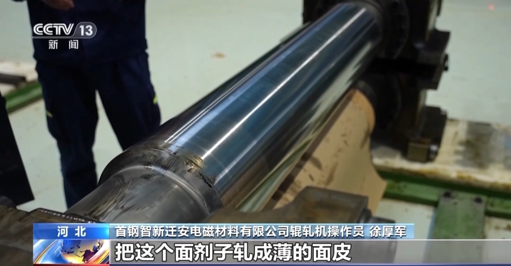 首鋼智新遷安電磁材料有限公司輥軋機操作員 徐厚軍:這就是軋制和帶鋼直接接觸的工作輥,如果說家里搟面的話,這就是我們的搟面杖。那個鋼鐵材料就相當(dāng)于面劑子,我們就用這個搟面杖,通過擠壓,把這個面劑子軋成薄的面皮。6個搟面杖串起來,一遍就軋出來了。生產(chǎn)效率比傳統(tǒng)生產(chǎn)方法高了8倍到10倍,這條機組軋制速度是1500米每分鐘,相當(dāng)于高速公路上以時速90公里開的小車一直在跑。