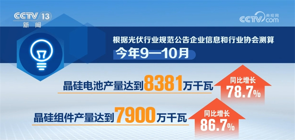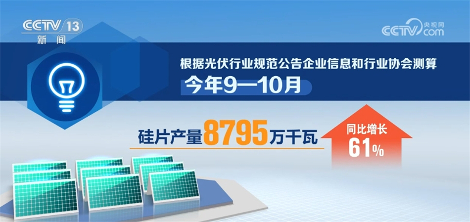 央視網(wǎng)消息:工業(yè)和信息化部12月13日發(fā)布當(dāng)前全國光伏制造行業(yè)最新運(yùn)行情況。數(shù)據(jù)顯示,今年9—10月,我國光伏制造業(yè)保持高位運(yùn)行,硅料、硅片、電池、組件產(chǎn)量同比增長均超60%。
