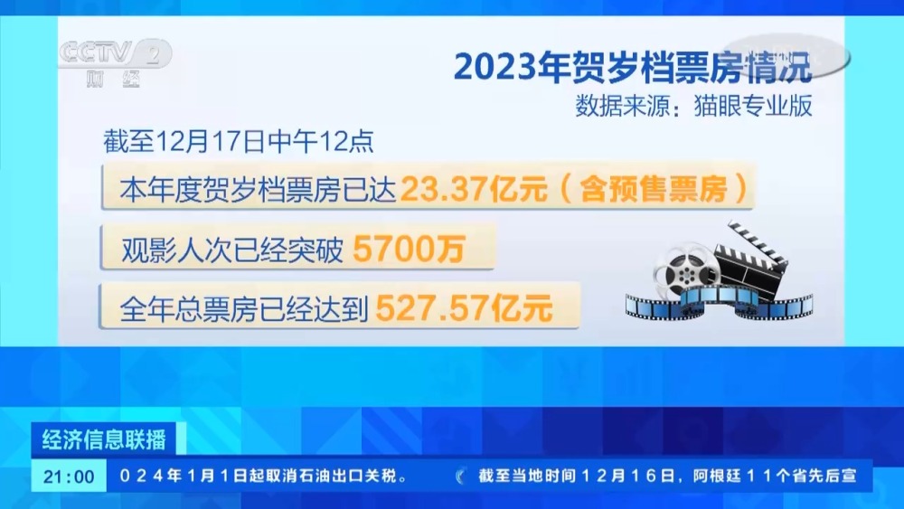 某電影數(shù)據(jù)平臺顯示,截至12月17日中午12點(diǎn),本年度賀歲檔票房已達(dá)23.37億元(含預(yù)售票房),觀影人次已經(jīng)突破5700萬,全年總票房已經(jīng)達(dá)到527.57億元。
