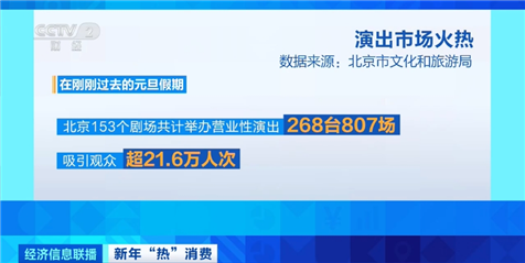 數(shù)據(jù)顯示,在剛剛過去的元旦假期,北京153個劇場共計舉辦營業(yè)性演出268臺807場,吸引觀眾超21.6萬人次,票房收入約5353.8萬元,同比2023年增長442.8%。