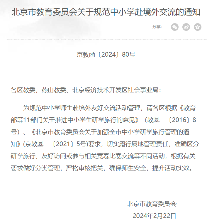 央廣網北京3月11日消息(記者馮儀)近日,北京市教委發(fā)布關于規(guī)范中小學赴境外交流的通知,通知中提到,請各區(qū)根據(jù)《教育部等11部門關于推進中小學生研學旅行的意見》(教基一〔2016〕8號)、《北京市教育委員會關于加強全市中小學研學旅行管理的通知》(京教基一〔2021〕5號)要求,切實履行屬地管理責任,準確區(qū)分研學旅行、友好訪問或參與相關競賽比賽交流等不同活動,根據(jù)有關要求做好分類管理,嚴格審核把關,確保師生安全,提升活動實效。