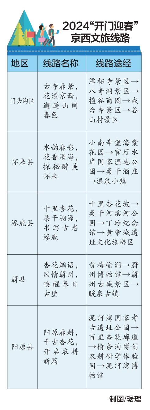 門頭溝區(qū)聯(lián)動(dòng)河北省張家口市懷來縣、涿鹿縣、蔚縣、陽(yáng)原縣共同發(fā)布“詩(shī)畫京西春暉行”五條春游線路,圍繞踏青、賞花、徒步、騎行、露營(yíng)、微度假等元素展開,為促進(jìn)京津冀消費(fèi)和北京一季度“開門紅”提供助力。