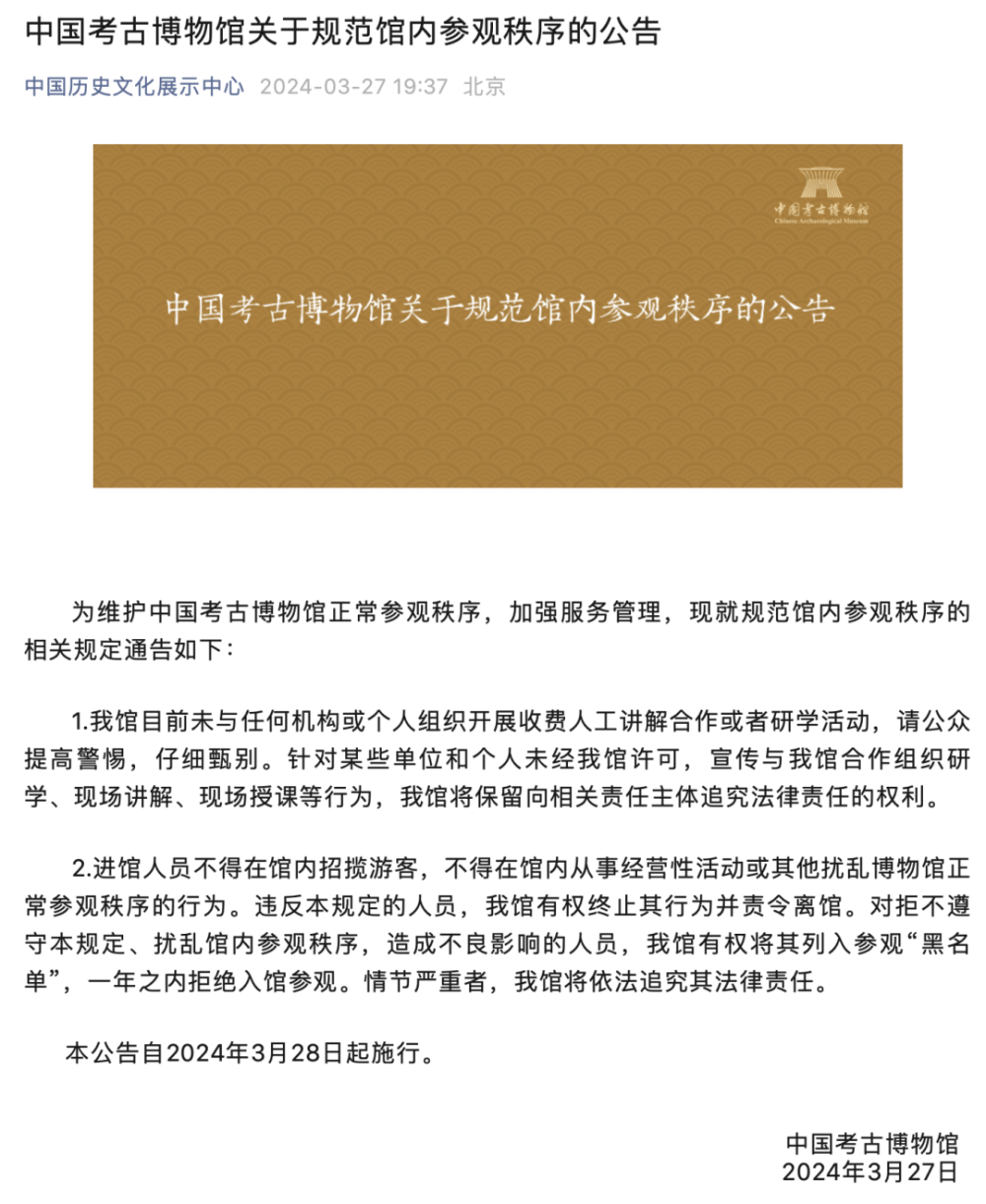 3月27日,中國考古博物館發(fā)布關(guān)于規(guī)范館內(nèi)參觀秩序的公告。