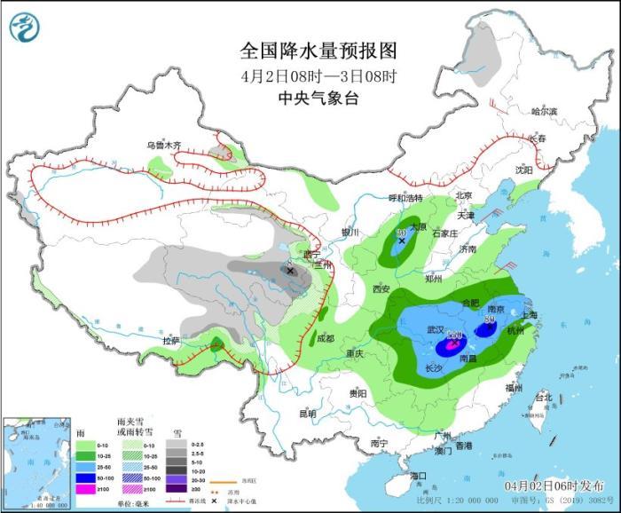 4月2日08時(shí)至3日08時(shí),內(nèi)蒙古東北部、西藏東部、甘肅河西、青海中南部、川西高原北部等地部分地區(qū)有小雪或雨夾雪,其中,西藏東南部、青海東南部、甘肅西南部等地部分地區(qū)有中到大雪(5~8毫米)。陜西東部、山西西部、黃淮南部、江淮大部、江漢、江南北部、四川盆地東部、重慶東北部等地部分地區(qū)有中到大雨,其中,湖北東南部、湖南東北部、安徽東南部、江西東北部等地部分地區(qū)有暴雨,局地大暴雨(100~150毫米)。內(nèi)蒙古東北部部分地區(qū)有4~5級風(fēng)。
