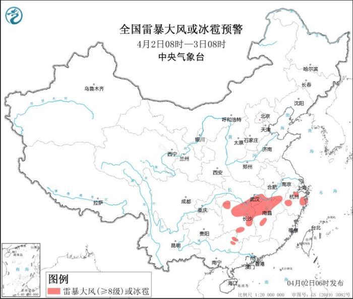 全國雷暴大風(fēng)或冰雹預(yù)警(4月2日08時(shí)-3日08時(shí))