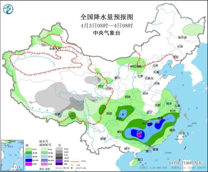 4月3日08時(shí)至4日08時(shí),新疆北疆北部和伊犁河谷沿天山一帶、西藏北部、青海東北部和南部、甘肅河西、川西高原北部、黑龍江東部等地部分地區(qū)有小到中雪或雨夾雪。江南中南部、西南地區(qū)東北部、華南北部等地部分地區(qū)有中到大雨,其中,湖南西南部、江西中部、廣西東北部、廣東西北部等地部分地區(qū)有暴雨或大暴雨(100~110毫米)。內(nèi)蒙古河套地區(qū)和中部、新疆沿天山地區(qū)、西藏南部等地部分地區(qū)有4~5級風(fēng)。