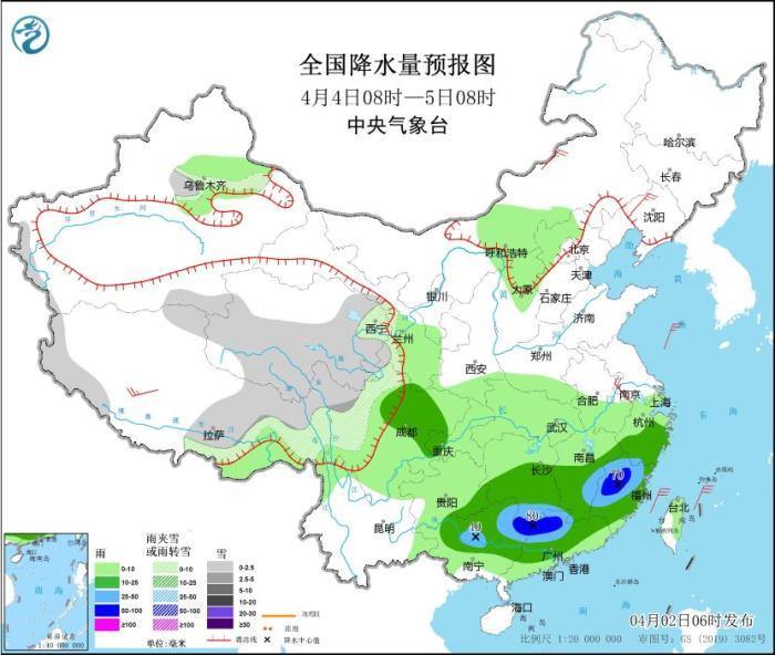 4月4日08時(shí)至5日08時(shí),新疆沿天山地區(qū)、西藏南部和東部、青海中南部、甘肅河西、川西高原北部等地部分地區(qū)有小到中雪或雨夾雪。四川盆地大部、重慶西南部、貴州東南部、江南中南部、華南中北部等地部分地區(qū)有中到大雨,其中,福建西北部、廣西東北部、廣東西北部等地部分地區(qū)有暴雨(50~80毫米)。內(nèi)蒙古中部、遼寧北部、西藏南部等地部分地區(qū)有4~5級風(fēng)。