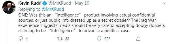 5月10日,陸克文在社交媒體再次連發(fā)五問,質(zhì)疑可能參與此次“甩鍋中國”事件的各方。他的第一問稱,這所謂的15頁“情報”,究竟是源于真實的絕密情報,還是根據(jù)公開信息拼湊而成?他表示,“伊拉克戰(zhàn)爭的教訓(xùn)早已告誡媒體,必須謹(jǐn)慎對待所謂的‘情報’,以防陷入某種政治目的之中。”