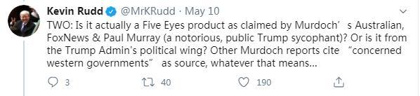 5月8日,陸克文更是在英國《衛(wèi)報》發(fā)表評論,揭批默多克旗下媒體的謊言,稱其擬將焦點轉(zhuǎn)向中國,為特朗普政府抗疫不力、造成眾多人員傷亡找借口,以助力特朗普連任。