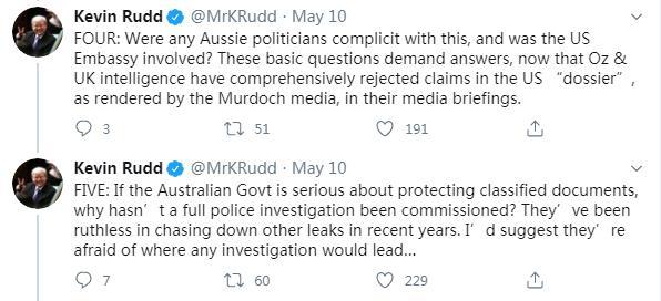 第二問直指“情報源頭”。陸克文表示,默多克旗下的媒體稱,這份“情報”來自西方“五眼聯(lián)盟”,真實情況究竟怎樣?這份“情報”是否出于特朗普黨派之手?