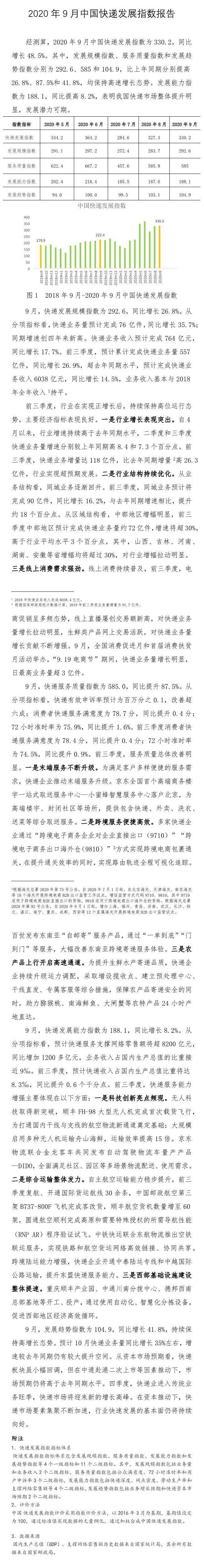 中新網(wǎng)10月10日電 據(jù)國家郵政局網(wǎng)站消息,國家郵政局10日公布2020年9月中國快遞發(fā)展指數(shù)報告。報告指出,經(jīng)測算,2020年9月中國快遞發(fā)展指數(shù)為330.2,同比增長48.5%。