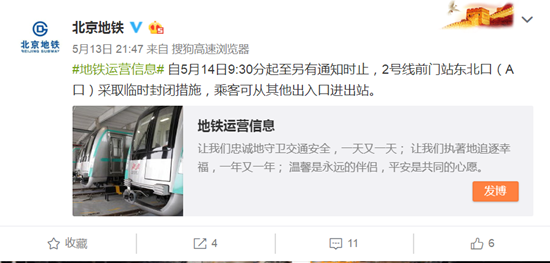 地鐵2號(hào)線前門站A口今日9:30起臨時(shí)封閉