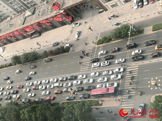 6月12日上午8時許,正值上班高峰期,石家莊市區(qū)主干道裕華路上,人多車多。裕華路與體育大街交口往東,北側(cè)是劍橋春雨小區(qū),南側(cè)是方北小區(qū),兩個小區(qū)門口正對裕華路的半幅機(jī)動車道上分別畫著斑馬線。因?yàn)楦浇袑W(xué)校,南北兩側(cè)陸陸續(xù)續(xù)有送孩子的家長或騎車人從斑馬線通過裕華路。每當(dāng)有人通過斑馬線時,裕華路上的汽車都會停下來等候。由于行人三五成群,不斷通過,路上的汽車不得不繼續(xù)等候,以至于排起了長龍。