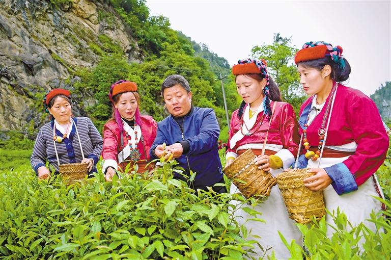 錯(cuò)那市勒布溝,安徽第七批援藏隊(duì)隊(duì)員裴含龍指導(dǎo)門巴族村民規(guī)范采摘茶葉。