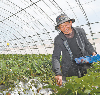 普瓊在草莓大棚里摘草莓。
