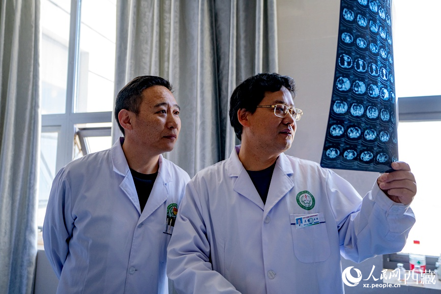 吳維(右一)和強巴旦增(右二)在查看患者的影像資料。人民日報記者 徐馭堯攝