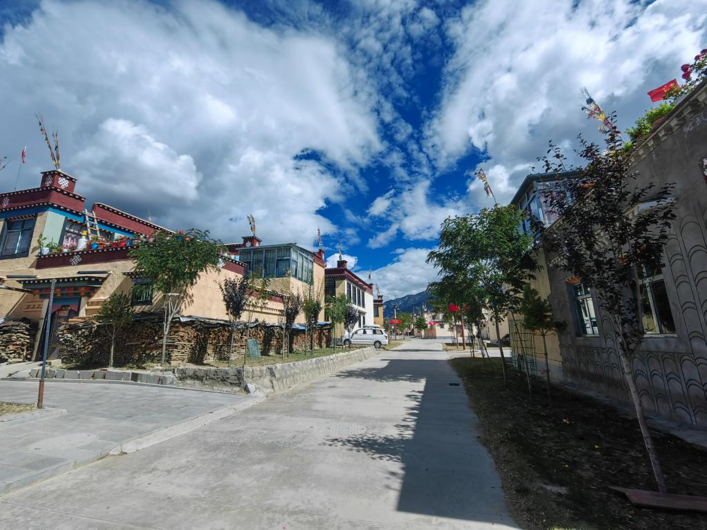 下山后的人們熱愛新家。許多人家在房頂插上國旗,在露臺上養(yǎng)花。達娃次仁被選為章達村黨支部書記。在他的帶動下,告別了沙土的村民們每周一自發(fā)輪流打掃村子衛(wèi)生。