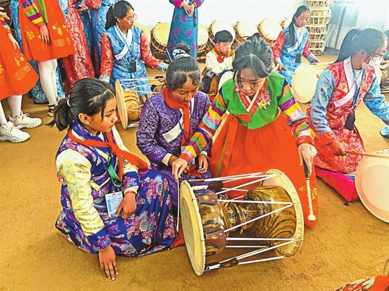 在“吉藏一家親”冬令營活動中,日喀則學(xué)生在朝鮮族學(xué)生指導(dǎo)下學(xué)習(xí)打朝鮮族長鼓。