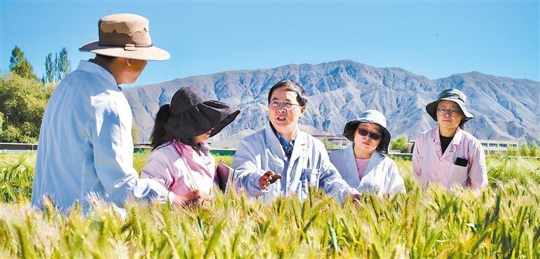 8月16日,山東援藏農(nóng)業(yè)專家、日喀則市農(nóng)牧業(yè)科學(xué)研究推廣中心副主任張斌(中)在青稞試驗田里指導(dǎo)種植。經(jīng)濟日報記者 袁勇 攝