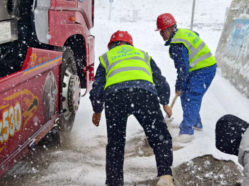 事發(fā)時,強降雪導(dǎo)致路面濕滑,卡車在行駛過程中出現(xiàn)打滑,甚至有滑坡的風(fēng)險。駕駛員在緊急制動過程中,車輛失控,險象環(huán)生。在這危急關(guān)頭,途經(jīng)此地的中交建設(shè)者們毫不猶豫地伸出援手。他們冒著嚴(yán)寒,鋪設(shè)碎石、沙子增加道路摩擦力。經(jīng)過一番艱苦努力,物資車輛終于緩緩駛離險境。