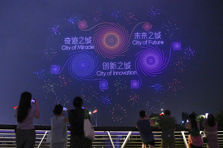 2024年9月26日,市民、游客在深圳灣觀看廣東深圳大漠大智控技術(shù)有限公司呈現(xiàn)的無人機編隊表演。新華社記者 梁旭 攝