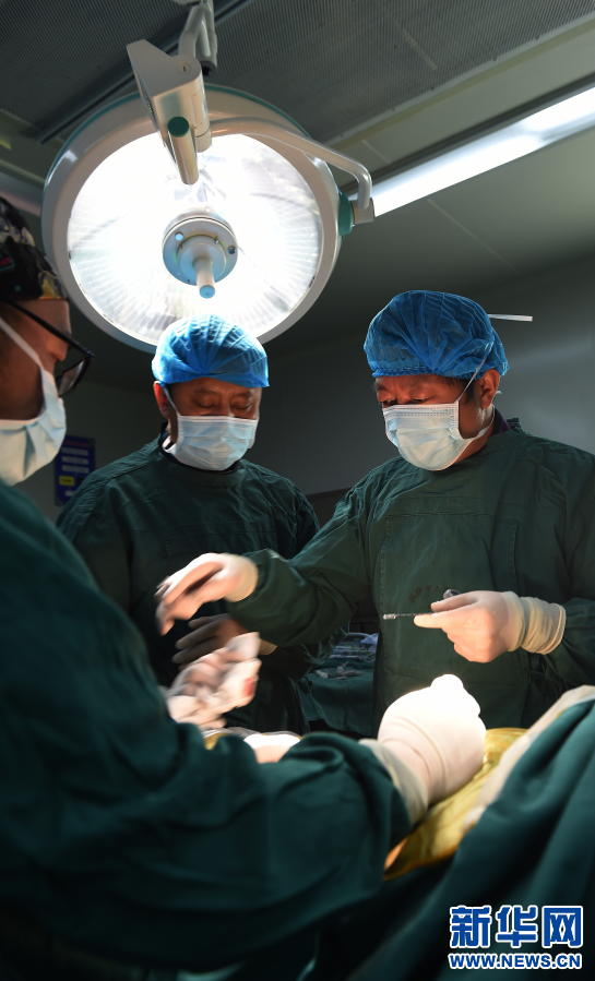 2017年5月26日,援藏醫(yī)生李家謀(右一)帶領(lǐng)拉薩市人民醫(yī)院的藏族醫(yī)生進行脊柱微創(chuàng)手術(shù)。新華社記者 覺果 攝