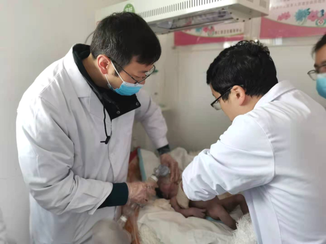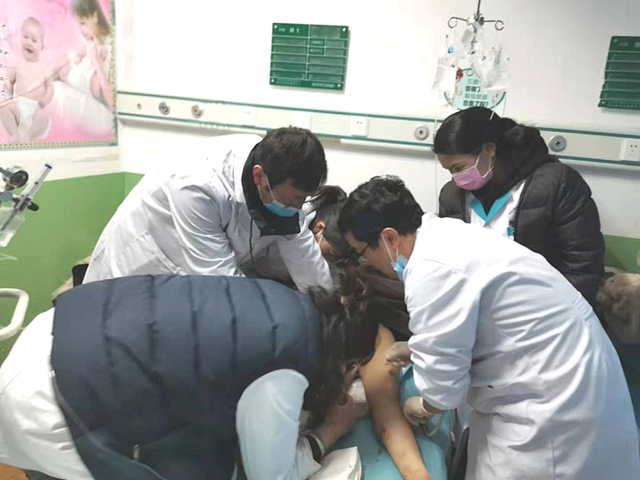 援藏醫(yī)療隊快速分工,組成新生兒復蘇團隊。呼吸球囊尚未到位,孫豐濤毫不猶豫地為孩子實施口對口人工呼吸。徐鴻宇立即給予“雙拇指環(huán)繞法”胸外心臟按壓,縣醫(yī)院婦產(chǎn)科醫(yī)護人員積極協(xié)助。斷臍處理后,迅速將孩子移至暖臺保暖,繼續(xù)胸外心臟按壓、呼吸球囊面罩輔助呼吸。經(jīng)過分秒必爭的搶救,孩子心跳恢復,全身皮膚轉(zhuǎn)紅潤,但呼吸和反應仍然不好。經(jīng)過與家屬溝通,徐鴻宇給予氣管插管,繼續(xù)人工輔助通氣,并將孩子轉(zhuǎn)往上級醫(yī)院繼續(xù)治療。在此期間,產(chǎn)婦胎盤順利娩出,生命體征平穩(wěn)。