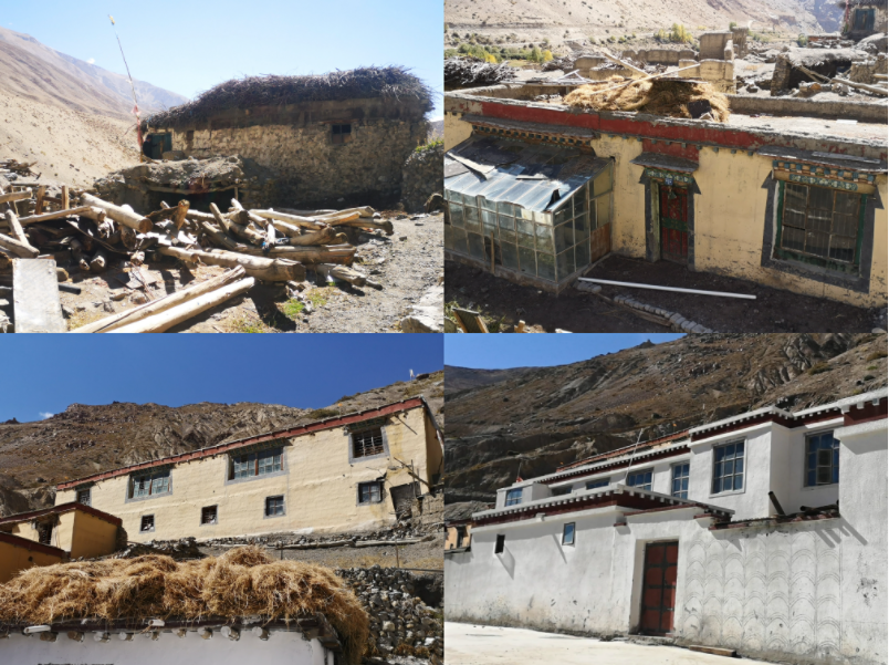 楚松村“四代房”拼圖。左上圖的土坯房是“第一代”,右上圖的土木房是“第二代”,“第三代”是左下圖的磚石房,右下圖是嶄新的兩層獨家院落,為“第四代”。新華社記者 董琳娜 攝